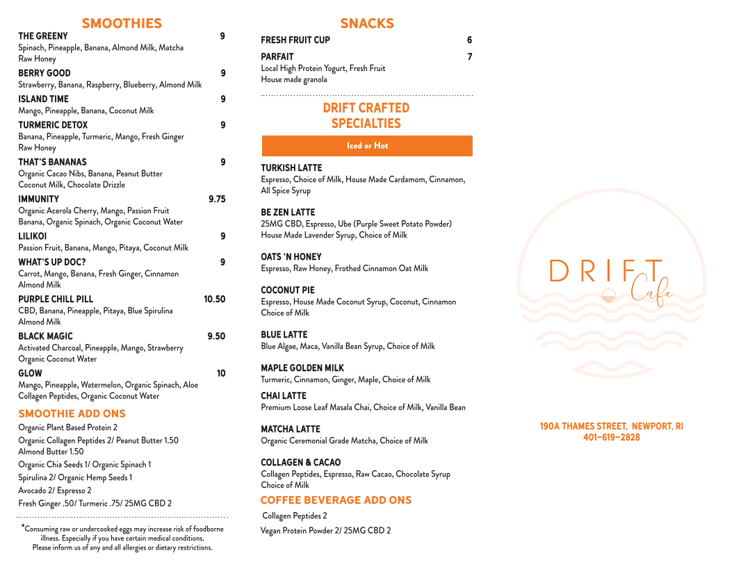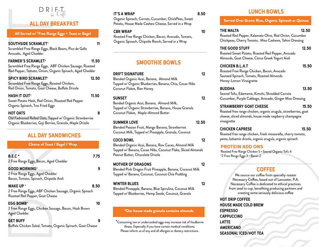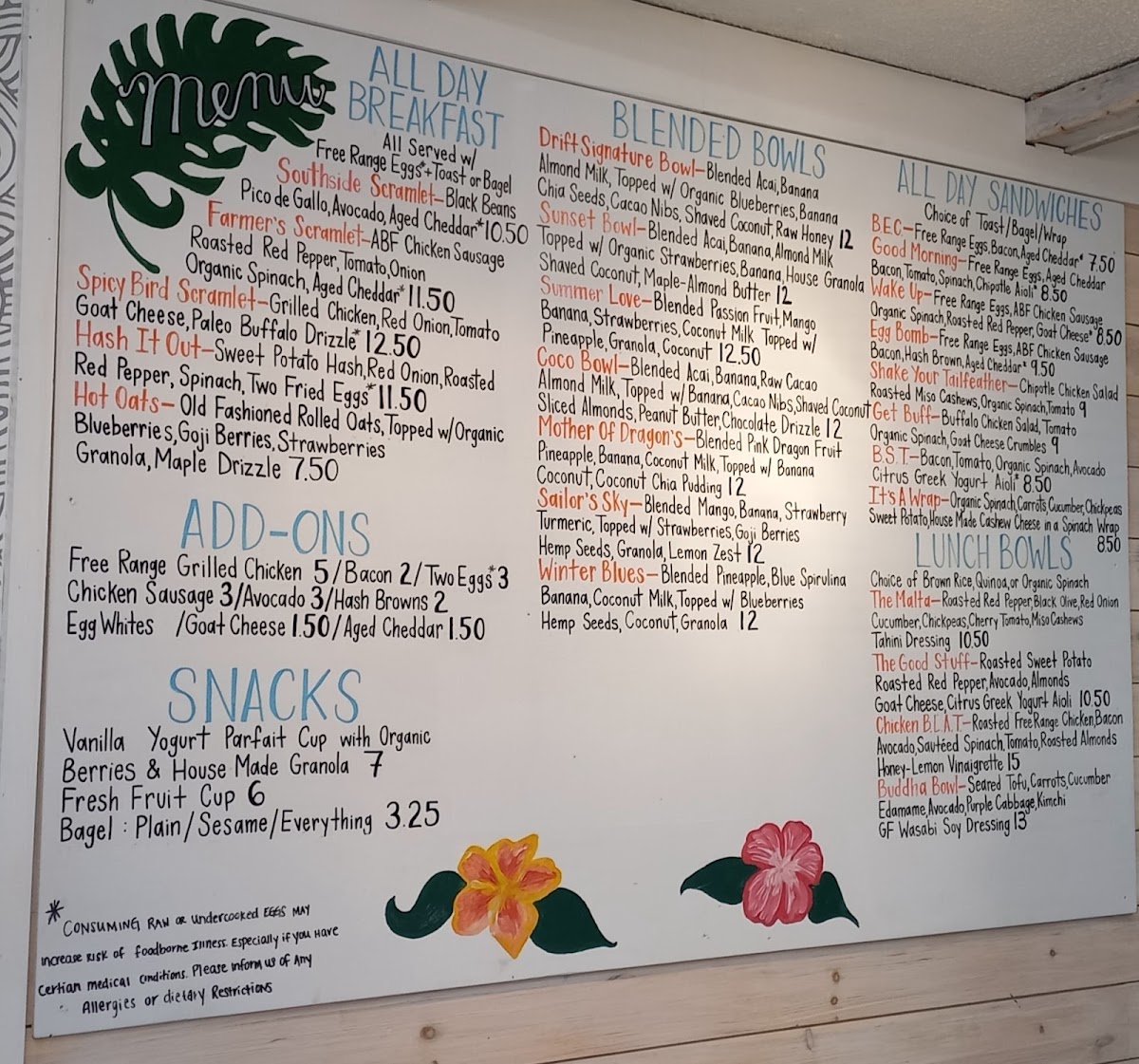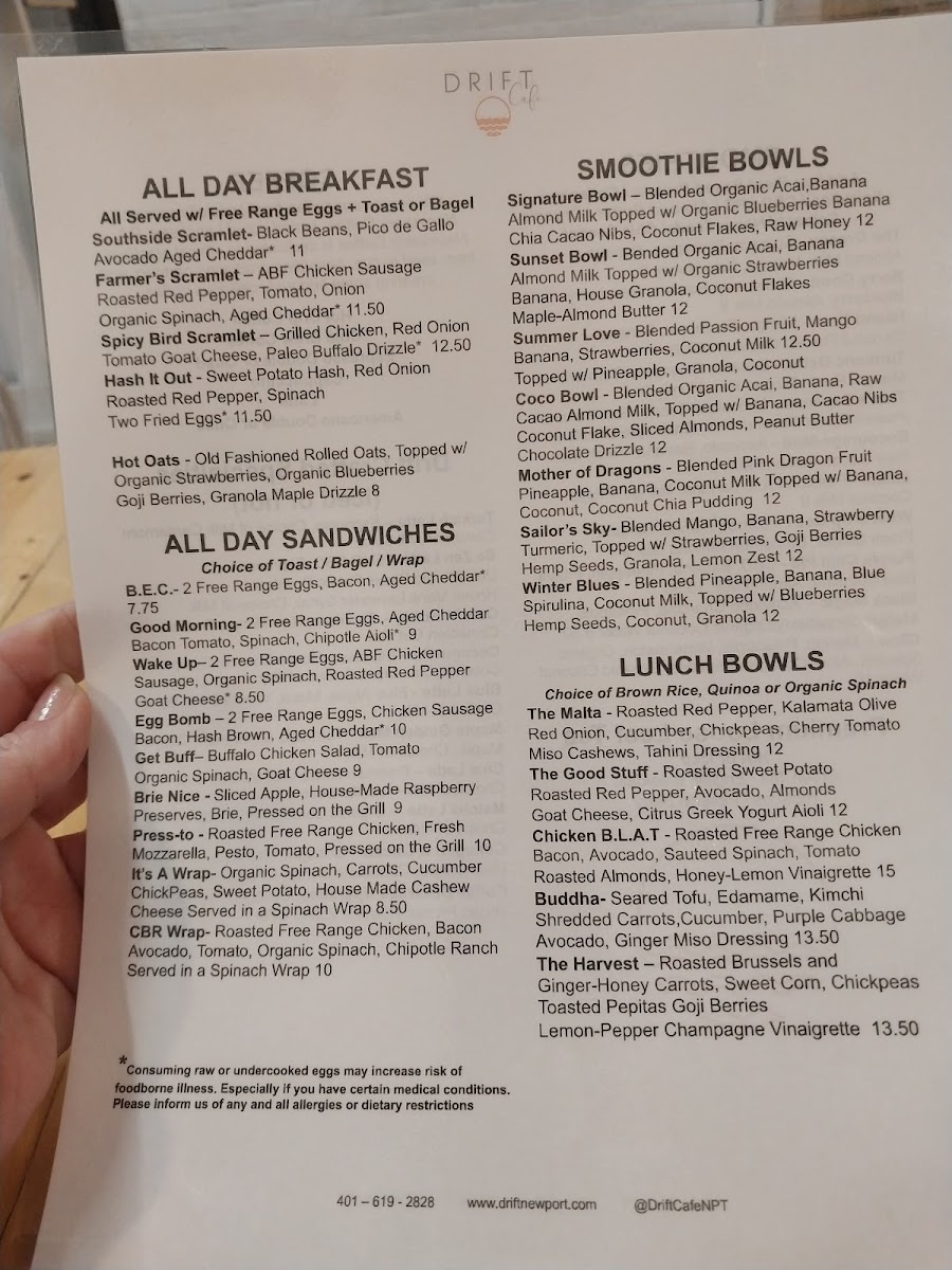 Welcome to Drift Cafe, a hidden gem on Thames Street in Newport, RI, where fresh ingredients meet hearty flavors to create a menu that excites the palate. Start your morning off with standout options like the Spicy Bird Scrambled Eggs or the Southside Scrambled Eggs, both showcasing free-range eggs in delightful combinations.